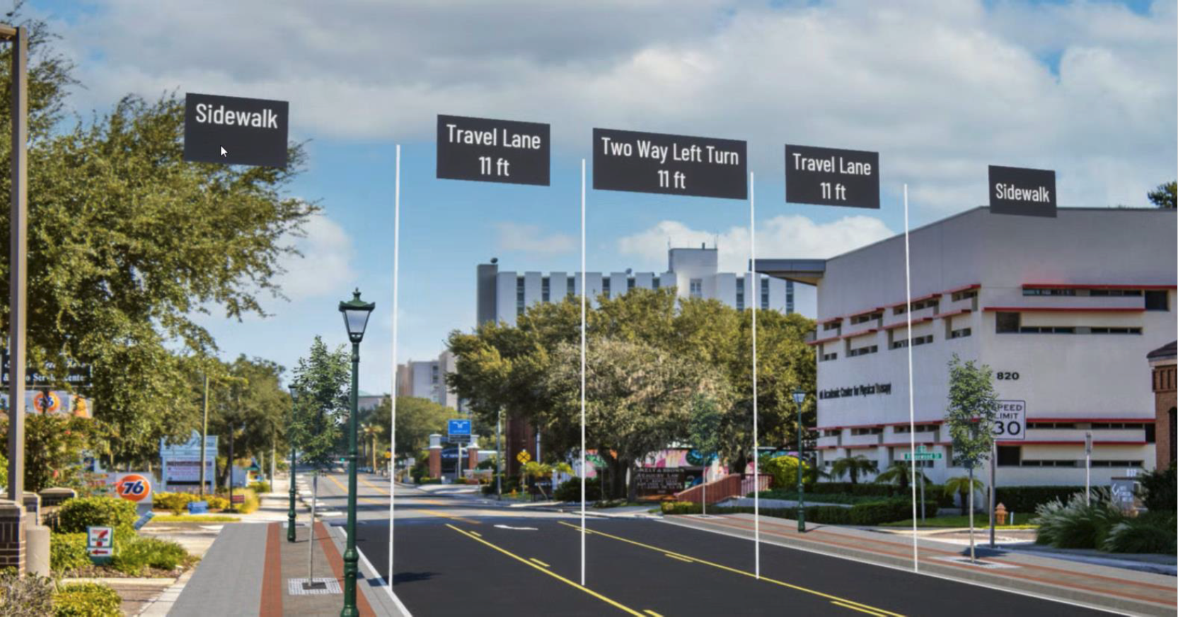 The road realignment gives South Florida Avenue three 11-foot travel lanes, instead of five 8.5-foot ones. | City of Lakeland