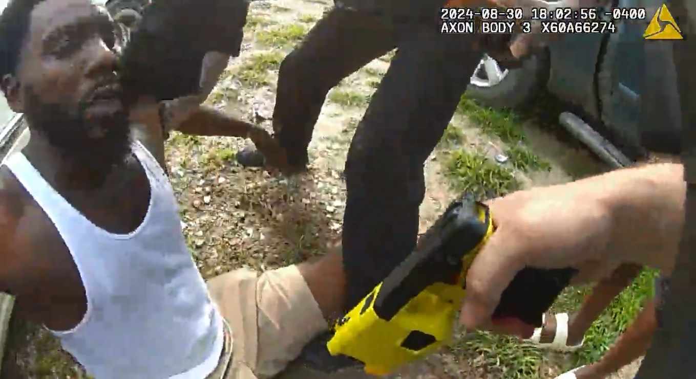 Lakeland Police Detectives Dillon Cornn, holding the yellow taser, and Jason Gates struggle to take Antwan Denard Glover into custody on Aug. 30, 2024. | Still image from a Lakeland Police Department body camera video