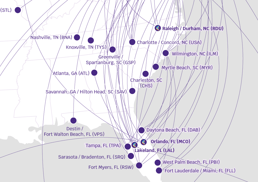A zoomed-in look at Avelo’s route map shows a logo on Lakeland designating it as one of eight bases nationwide. To see the full map, click here.