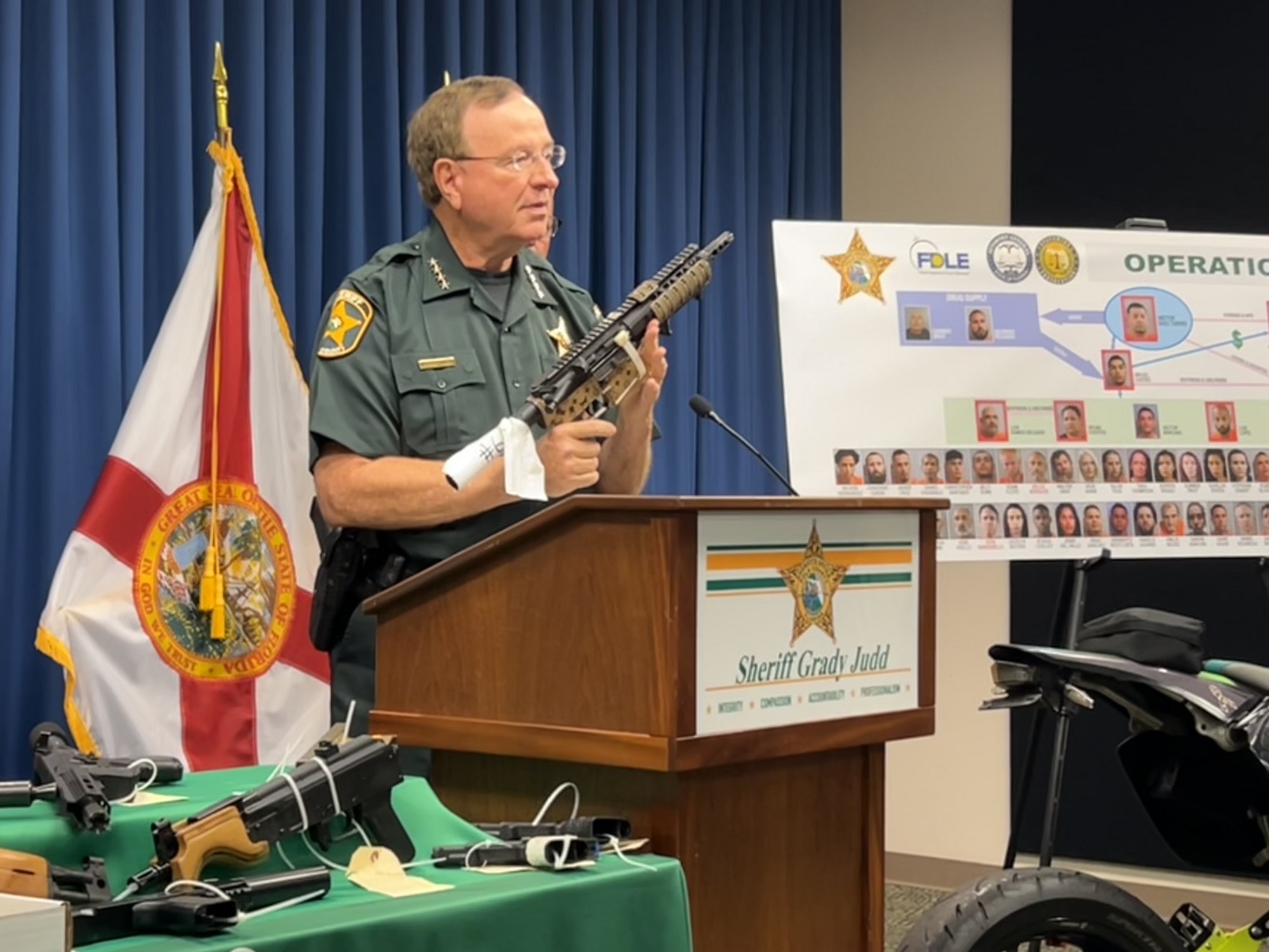 Polk County Sheriff Grady Judd holds up a semi-automatic weapon, emblazoned with a Louis Vuitton logo, during a press conference on Friday, June 28, 2024. | Kimberly C. Moore, LkldNow