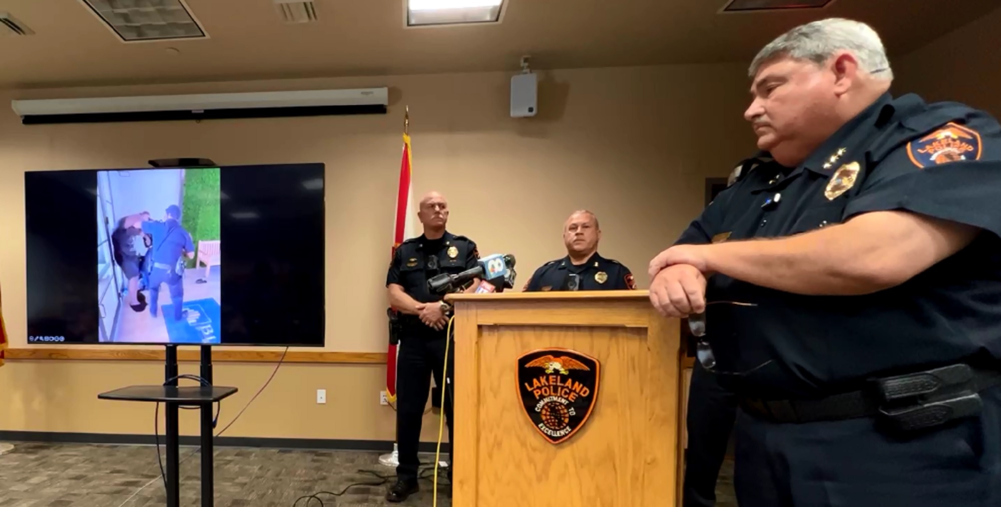 Lakeland Police Chief Sam Taylor watches as a video of the arrest of a teen is shown during a press conference. The officers involved were cleared of wrongdoing. | Lakeland Police Department