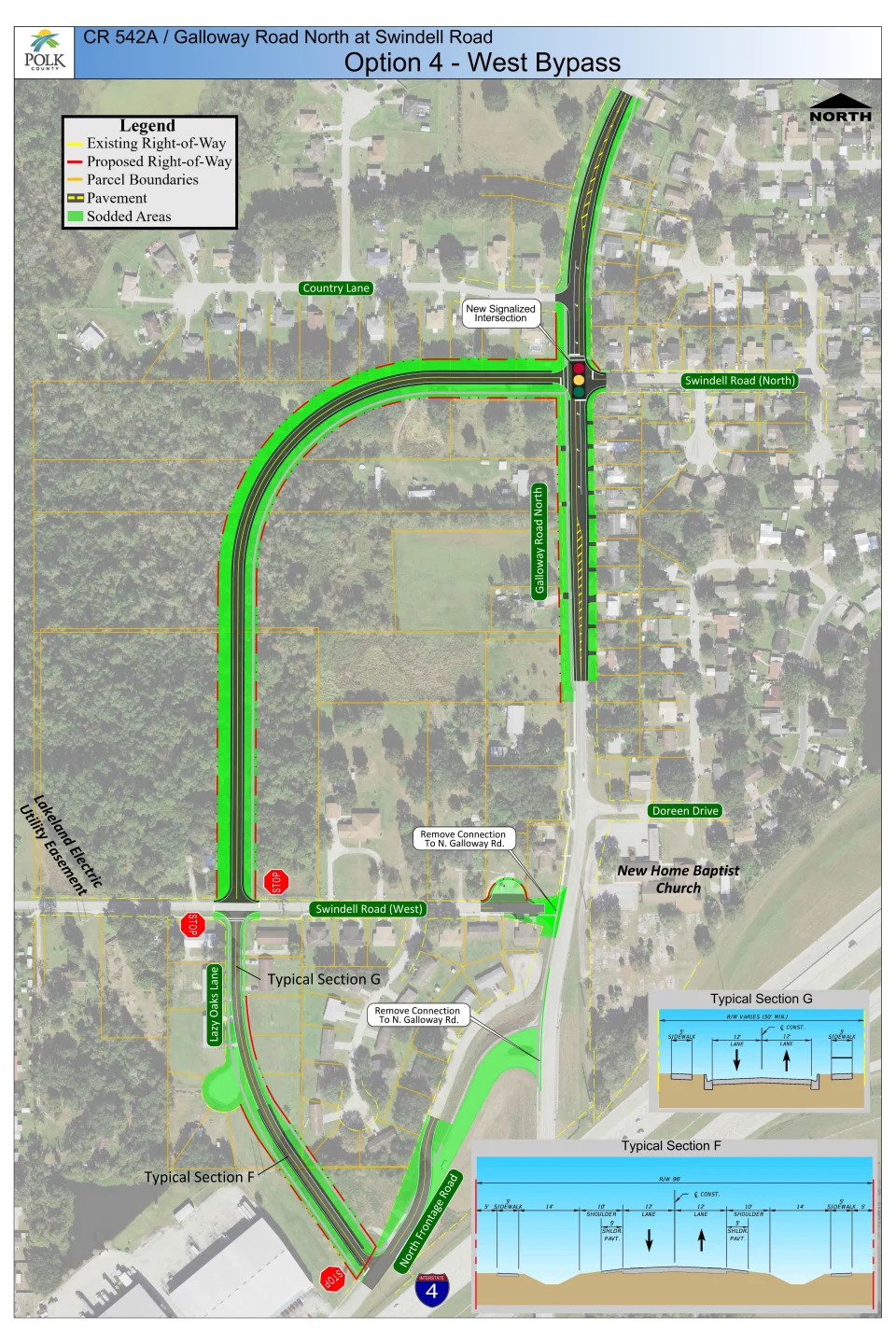 A more expensive option for Galloway and Swindell Roads would be to cut a bypass through a wooded area west of Galloway and extend it south, perhaps all the way to North Frontage Road. In this scenario, the southern connection to Galloway would be closed, converting Swindell Road West to a cul-de-sac. | Polk County Roads & Drainage Division