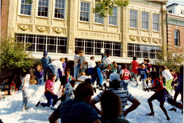 In a 1991 photo, children climb and play on a huge pile of snow trucked in for Lakeland’s annual Snow Fest. The Kress Building can be seen in the background. | Lakeland Downtown Development Authority, Lakeland Public Library